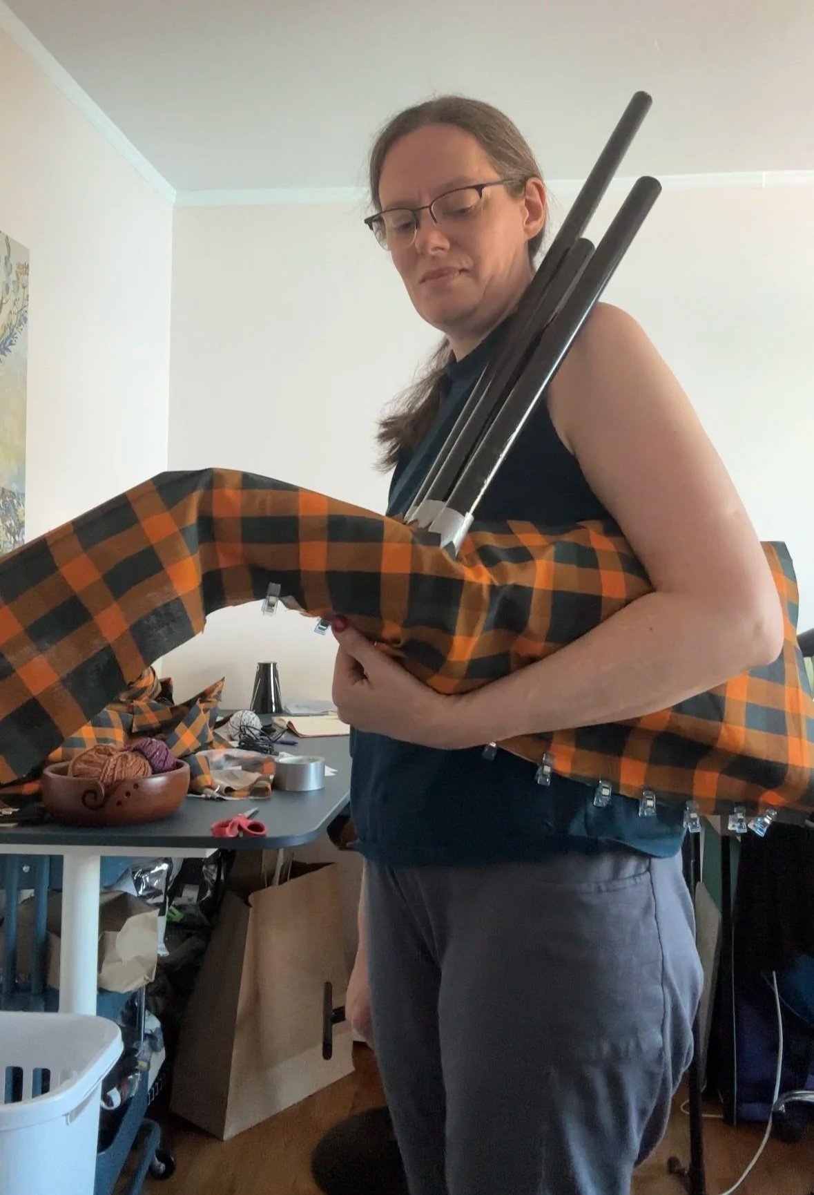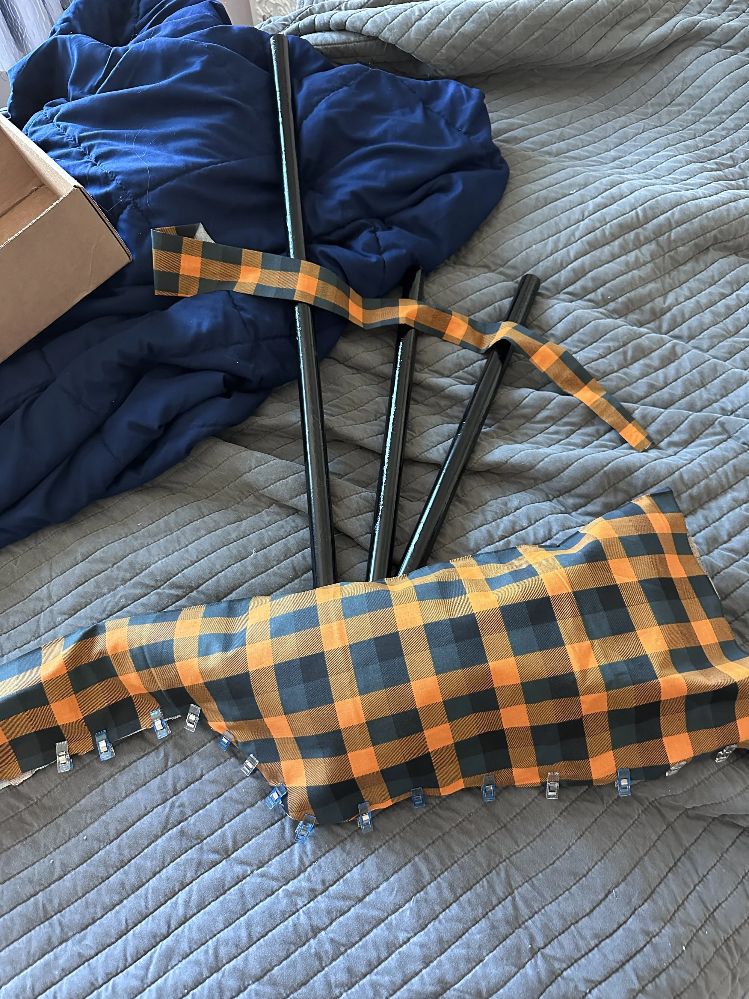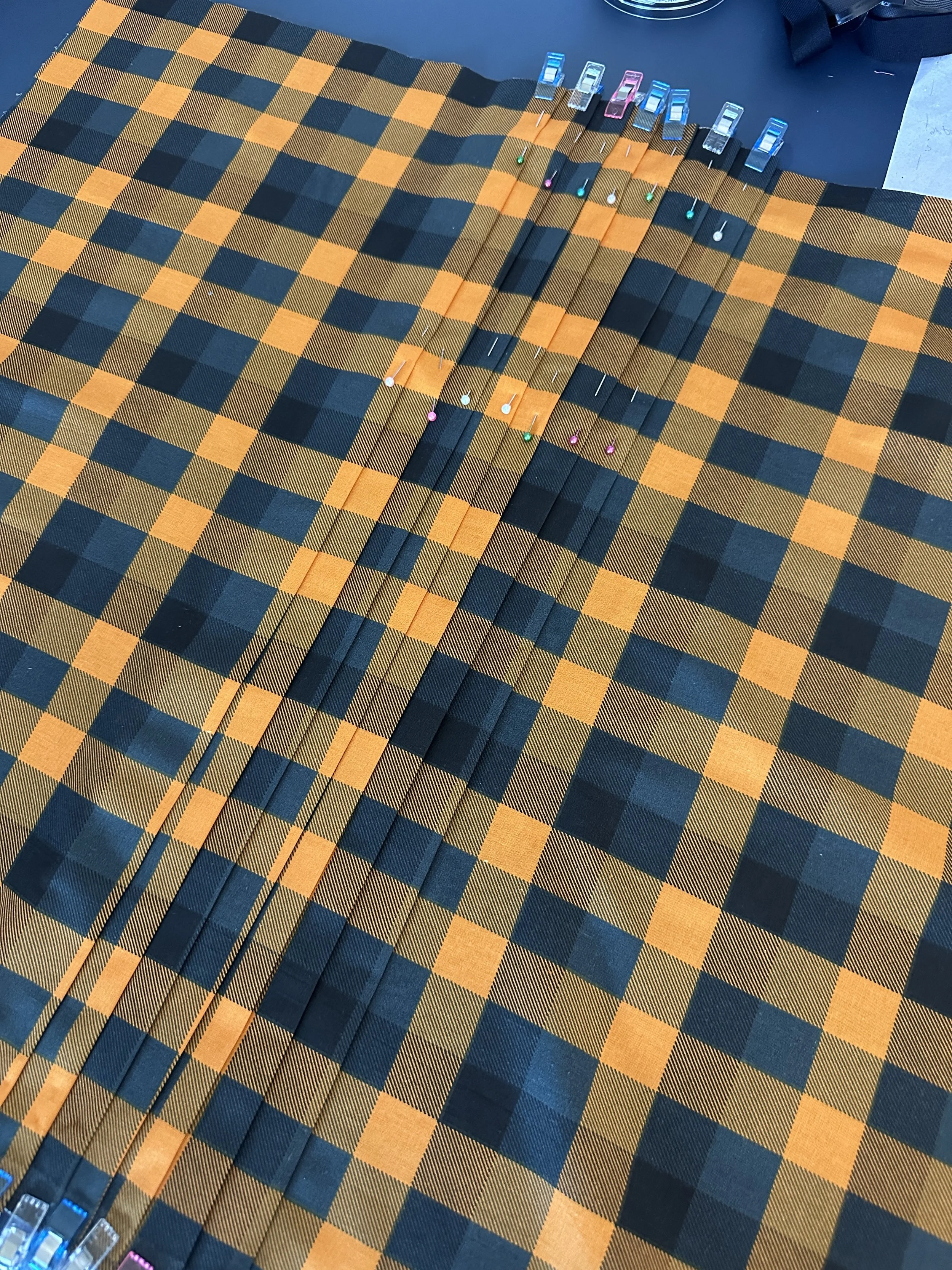 Before Joann’s closed, I bought up what felt like a million yards of an orange and navy fabric which would sort of pass as a tartan. I had 4 skeletons to clothe, and I decided to make 2 traditional style type kilts, and then two wraparound style kilts.