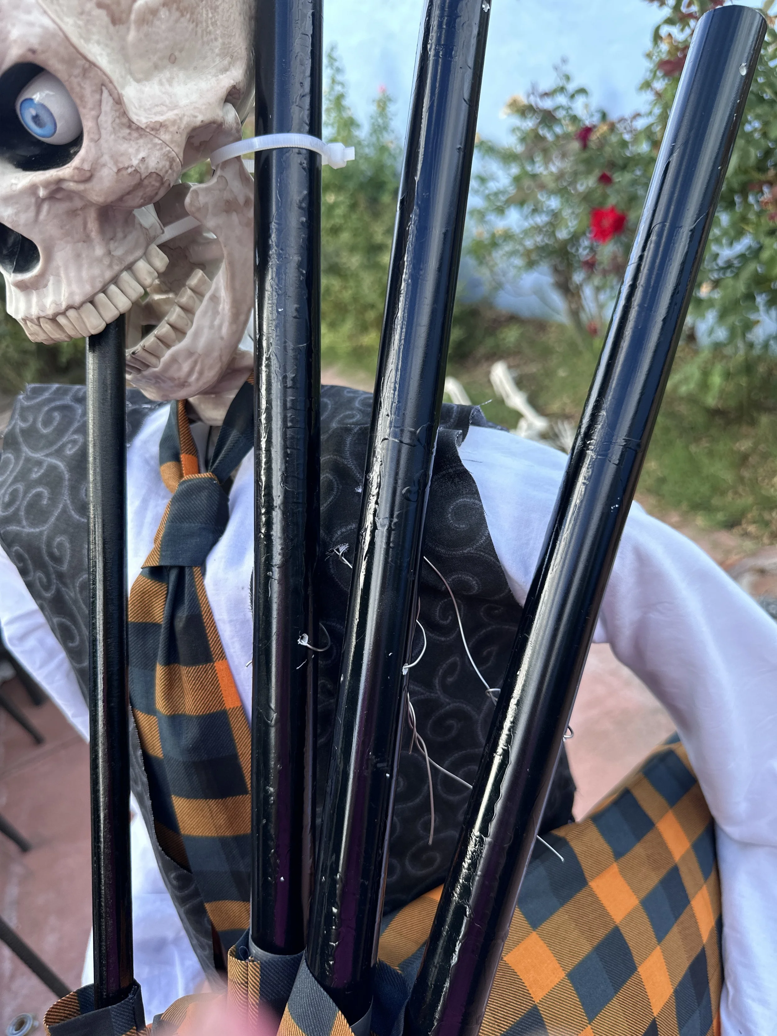 When I was putting together the skeleton stand, I realised the PVC pipe used would also be perfect for my bagpipe drones and chanter. I cut them to the correct length and spray painted them black.