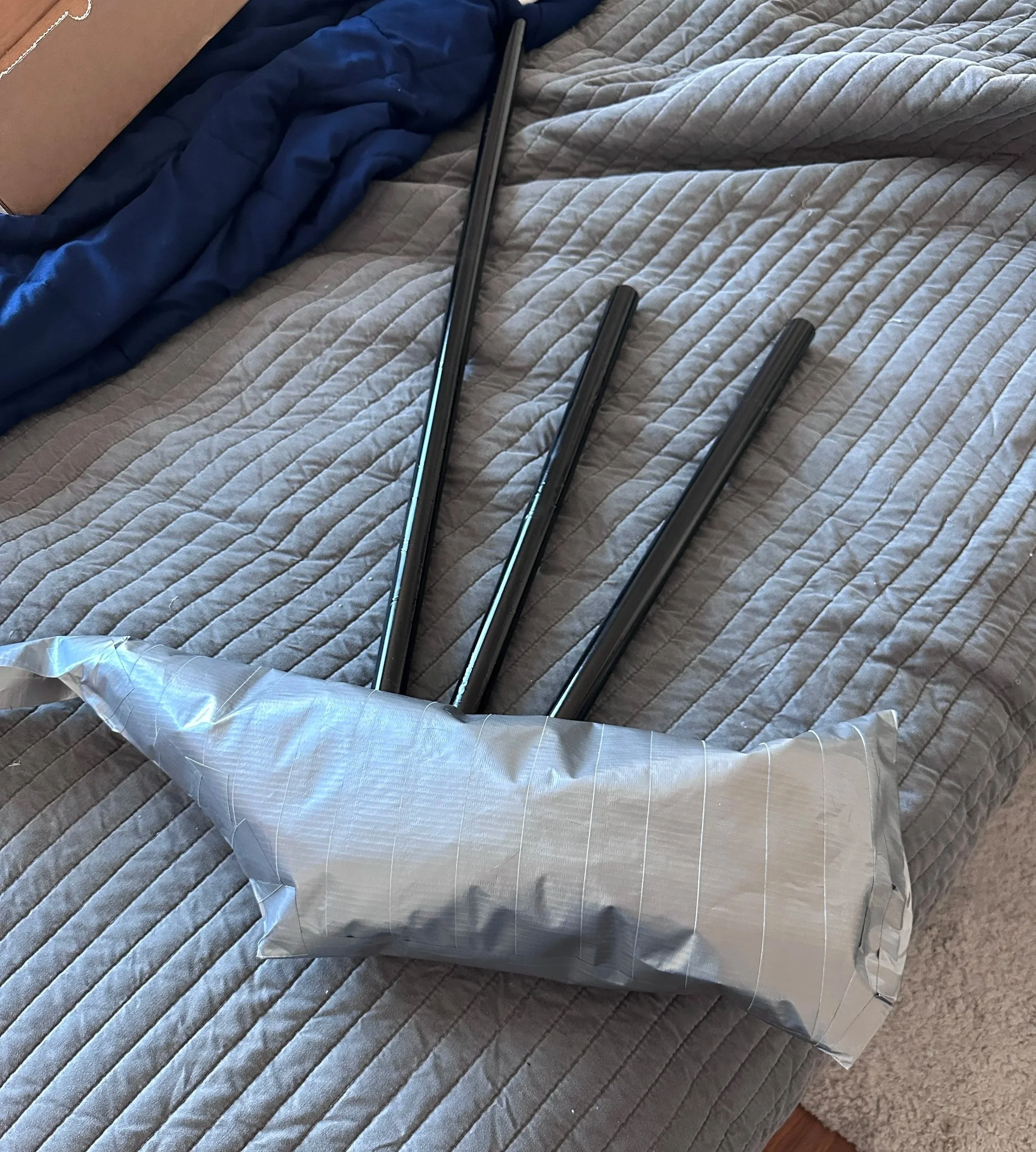 To attach each drone to the bag, I used more duct tape, going round and round the base of each drone, then taping some strips lengthways to secure it more. This was not easy! The PVC pipe was pretty heavy, and I had to prop each drone up on pillows to support it while I was trying to attach it.