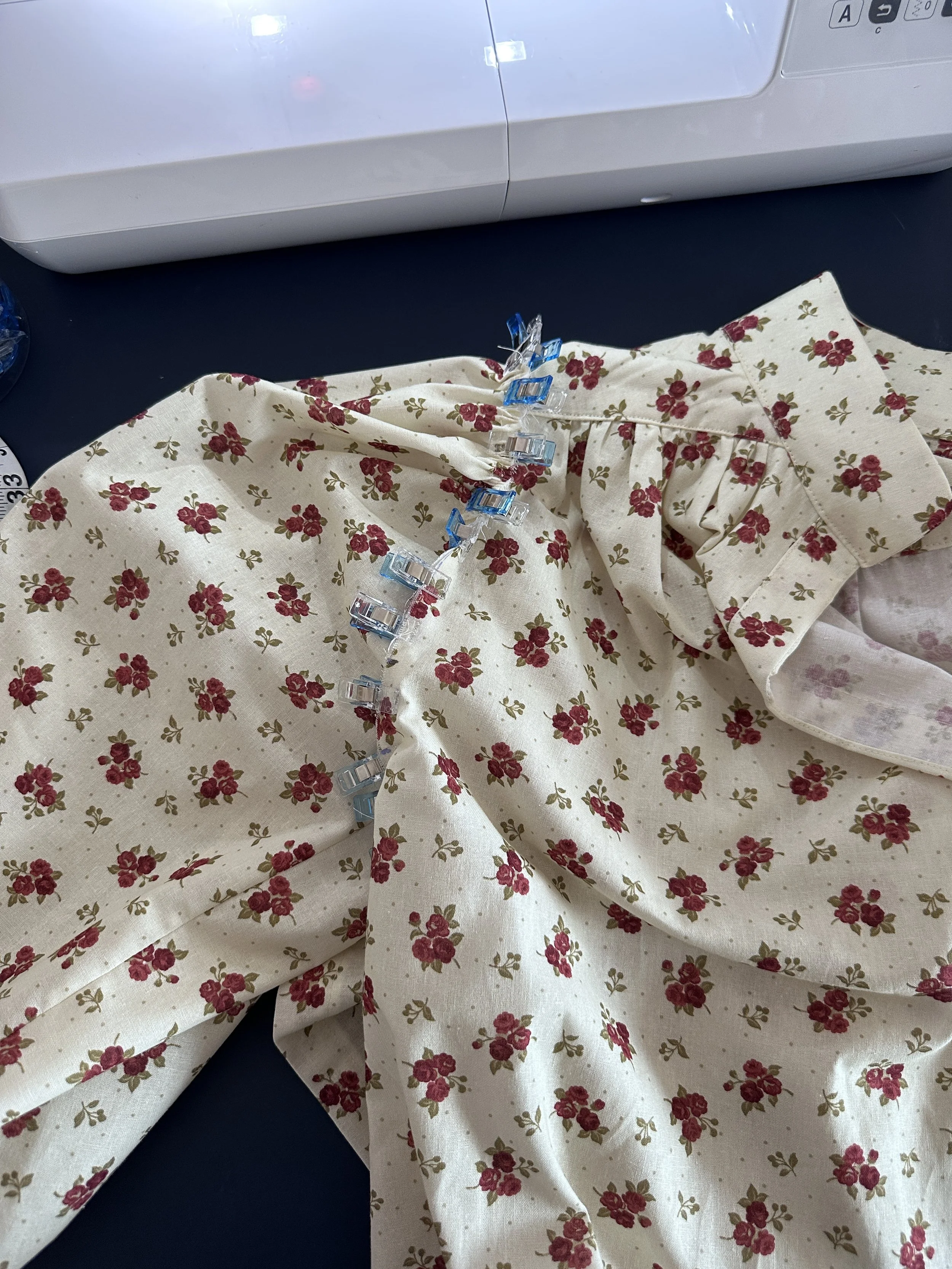 I procrastinated for a few days before attempting the sleeves. I don’t know if things have changed since I printed the pattern, but Truly Victorian has this thing of not making it clear what side each sleeve goes on. If you read the instructions, they say to match the sleeve seam to the notch marked in the arm hole. It took me a few hours to decided which sleeve went where, experimenting with placement and comparing it to other blouses I own. I’d dropped the arm hole slightly, (I’m a sweaty gal and hate tight clothes digging into my armpits), so the all-important notch didn’t exist. With a lot of luck and a million clips, I got it to work.